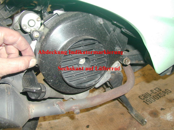 Um den richtigen Punkt zur Überprüfung des Ventilspiels zu finden , muss die Kurbelwelle gedreht werden . Dies geschieht durch den Sechskant auf dem Lüfterrad der Lichtmaschine unterhalb des Indikatordeckels .