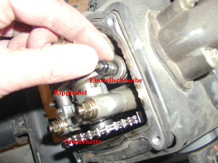 Es gibt hier zwei Einstellschrauben : Eine für das Einlassventil ( hier kommt das Kraftstoff-Luftgemisch in den Motor ) und eine für das Auslassventil ( hier gehen die verbrannten Abgase in den Auspuff ) .